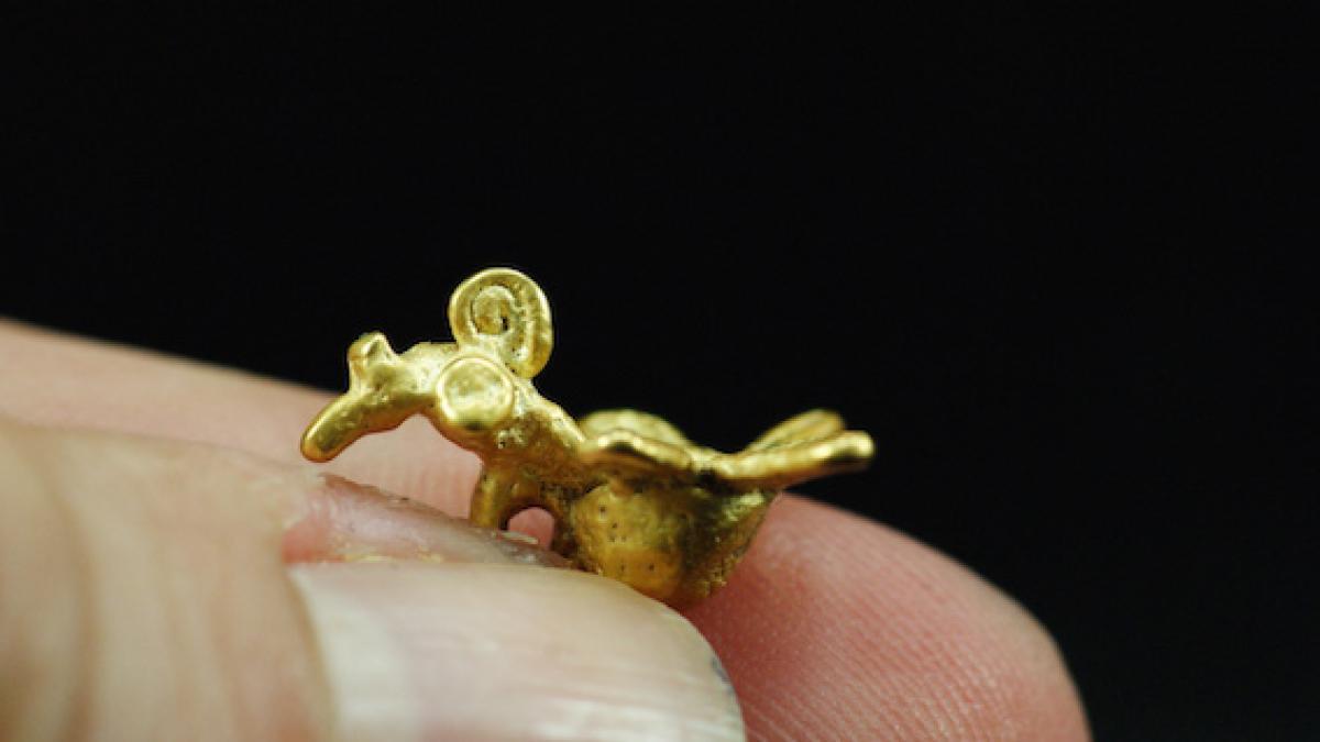 377 - Pendiente figurativo de oro fundido con la representación de un murciélago bicéfalo en vuelo que formaba parte del ajuar del individuo I5 de la tumba T2. EL aro de suspensión se localiza...
