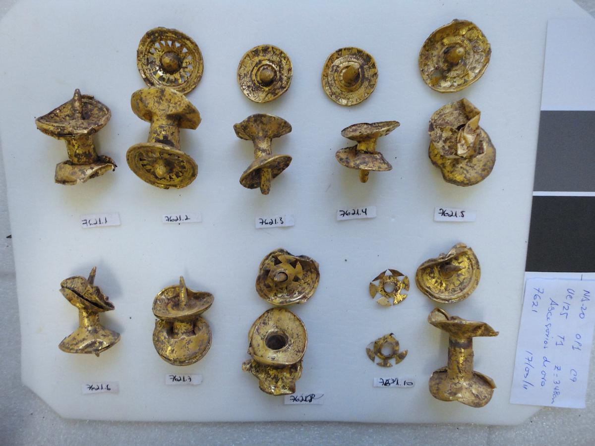 425 - Tapón de la orejera de piedra y fundas de oro registrada con el número 5083 y asociada al individuo I05 encontrado en la unidad UE088 (primer nivel de la tumba T2).