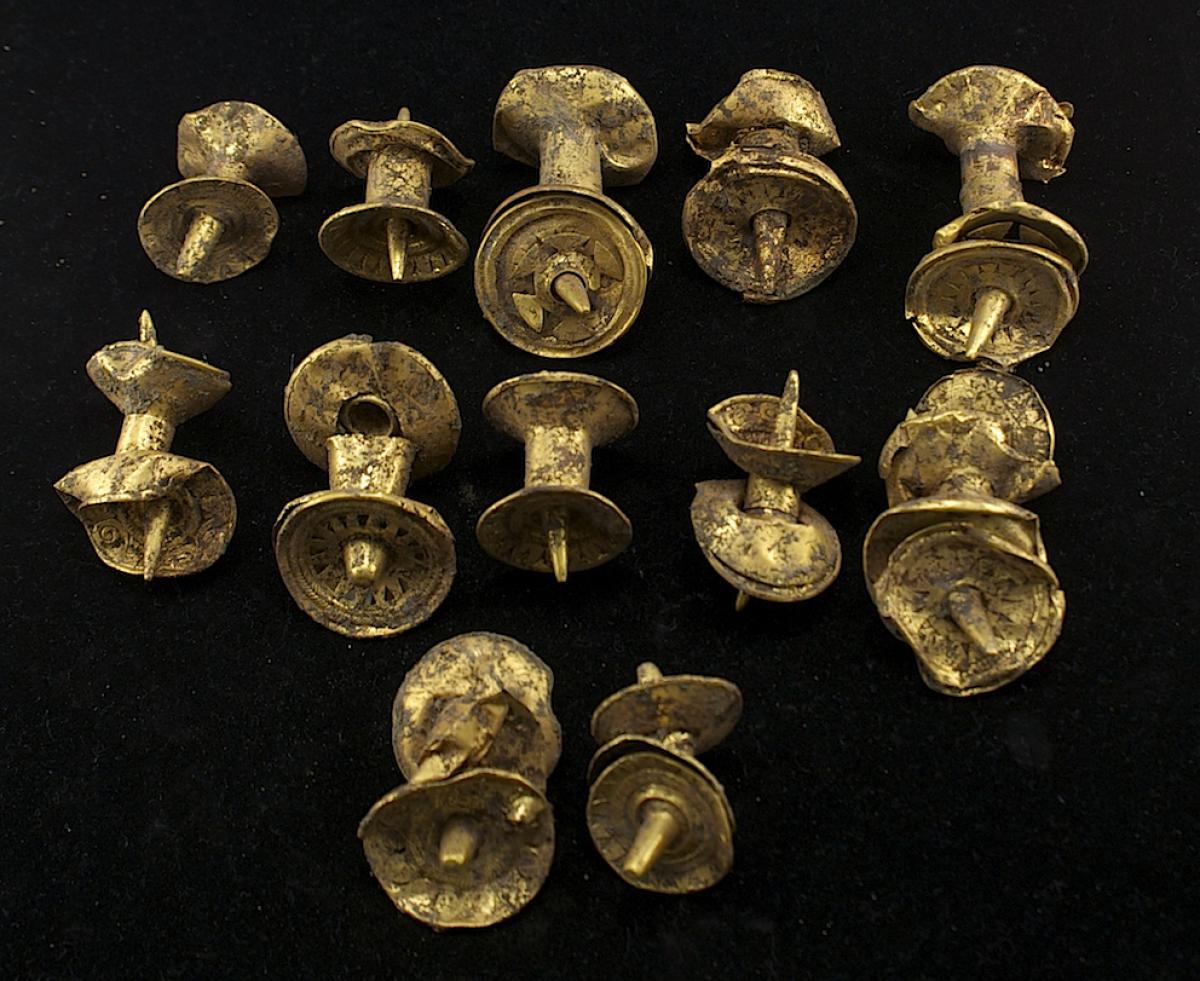 452 - Brazalete troncocónico elaborado con una lámina de oro perteneciente al ajuar del individuo I1 de la tumba T1. Lleva cuatro orificios para introducir los elementos de atado.