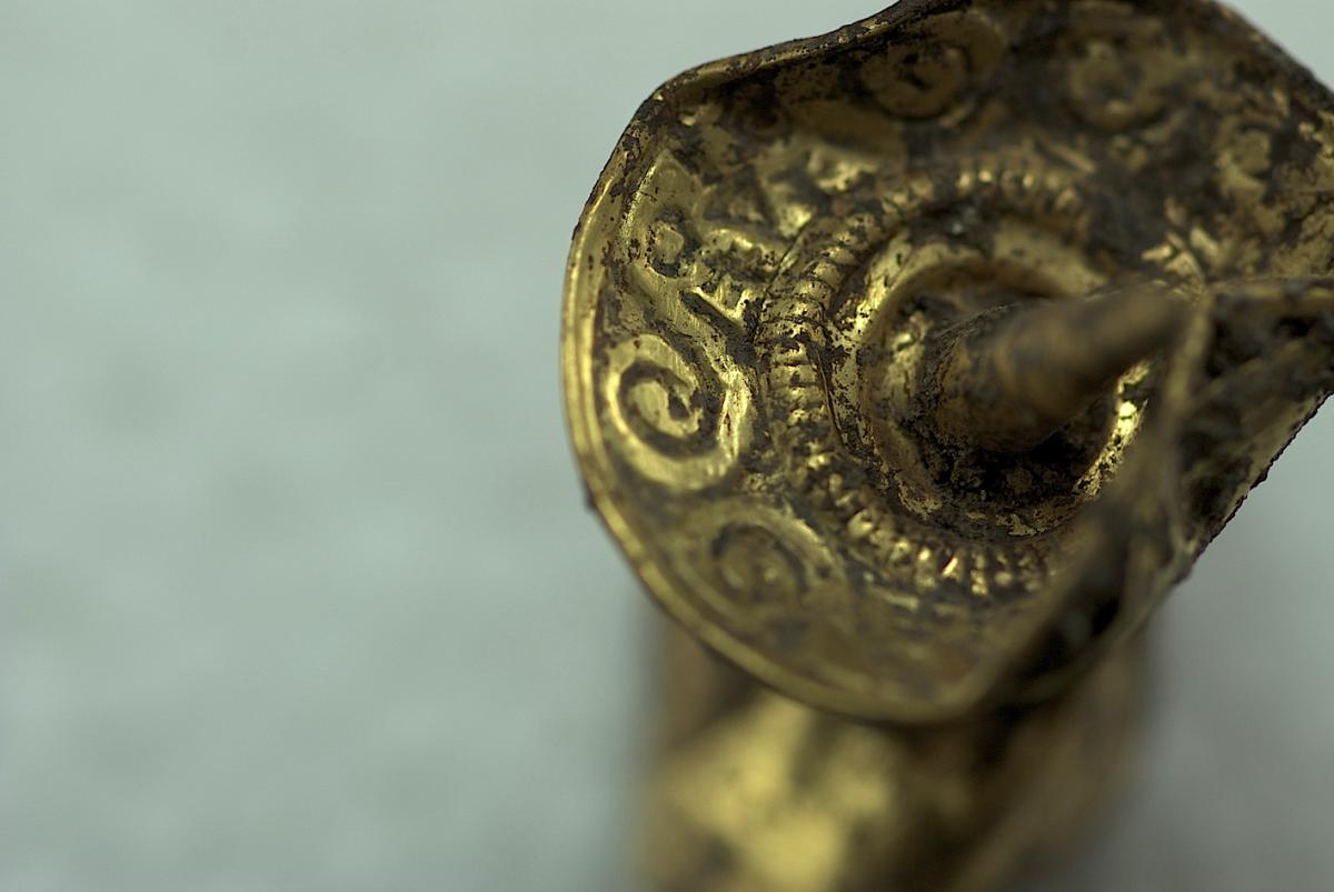 398 - Pendiente figurativo de oro fundido que formaba parte del ajuar del individuo I9 de la tumba T2. Es una figura masculina bicéfala desnuda en pie que sostiene con ambas manos una trompeta ce...