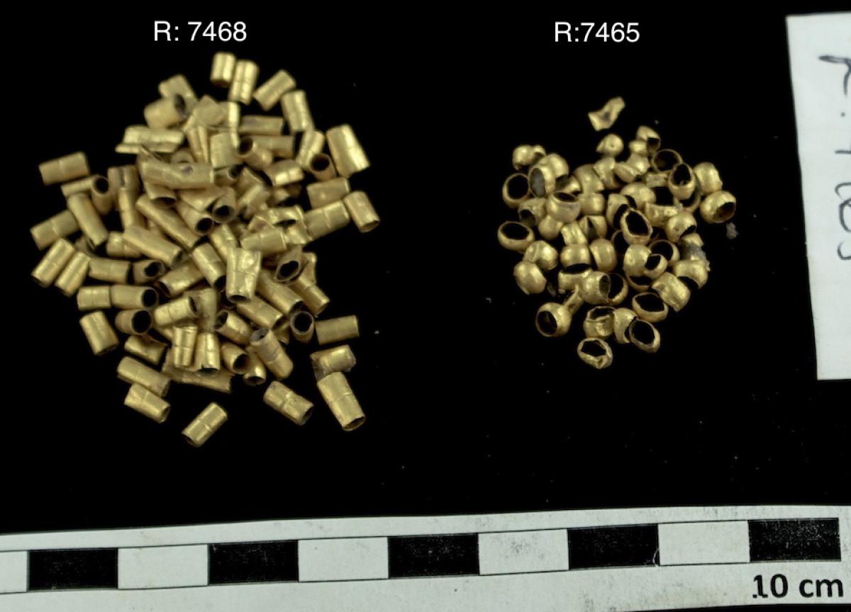 Información del recurso:  Grupo de artefactos de oro del ajuar funerario en miniatura encontrado en los rellenos de la tumba T3. Las cuentas aparecieron adheridas a un pectoral en miniatura.