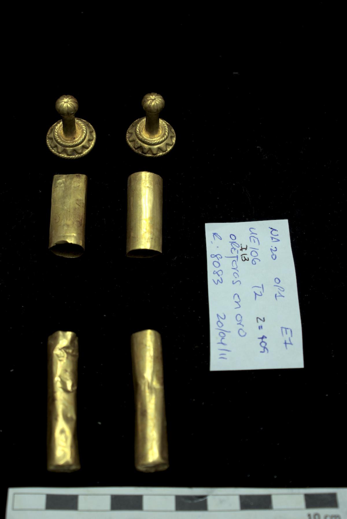 409 - Par de orejeras tubulares de piedra verde (glauconita) con fundas laminares de oro en los extremos, formaban parte del ajuar del individuo I7 de la tumba T2.