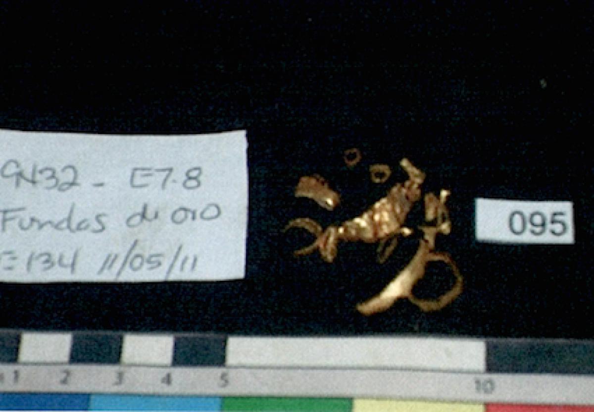 377 - Pendiente figurativo de oro fundido con la representación de un murciélago bicéfalo en vuelo que formaba parte del ajuar del individuo I5 de la tumba T2. EL aro de suspensión se localiza...