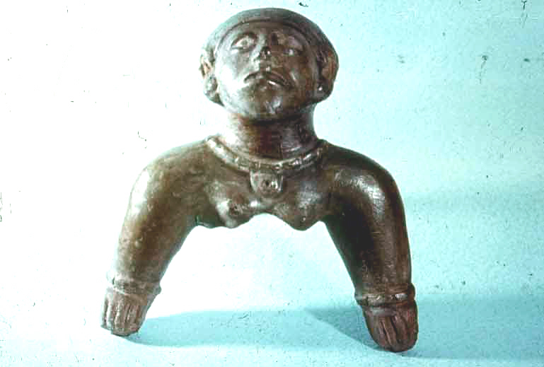 2255 - Vástago de pie de vasija fragmentado que representa una figura humana sede...