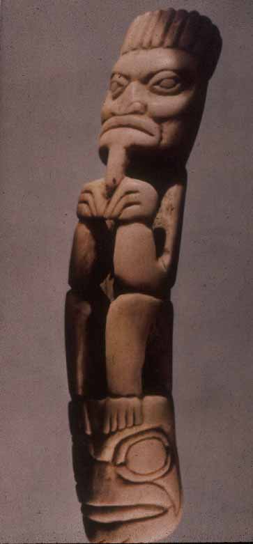 90 - Cabeza antropomorfa de madera de balsa que forma parte de un bastón. Tiene...