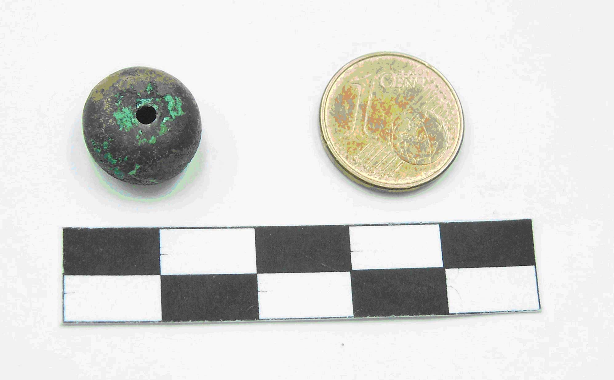 2208 - Cuenta de vidrio de forma globular, más extrecha en una de las extremidade...