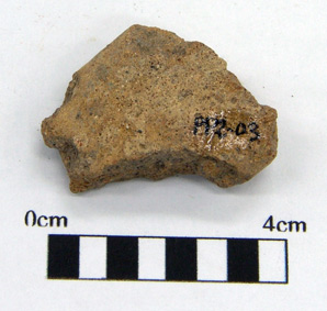2257 - Pie de vasija cerámica fragmentado que representa una figura sólida sede...