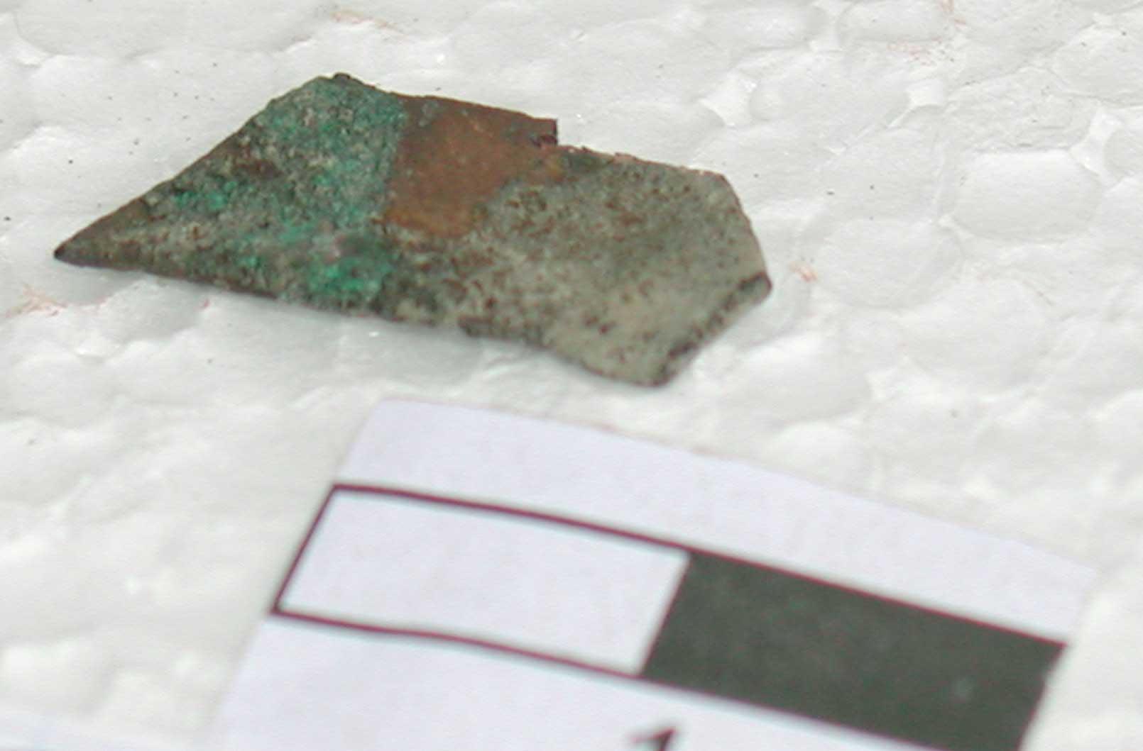 2211 - Pequeño fragmento de una fina placa, dorada por las dos caras, aparecida e...