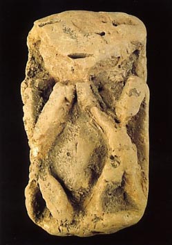 2255 - Vástago de pie de vasija fragmentado que representa una figura humana sede...