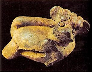 2242 - Pie de vasija sólida fragmentado que representa una figurita sedente. Dent...