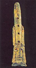 32 - Figura antropomorfa esquemática con incrustaciones de avalorios (rojo y ne...