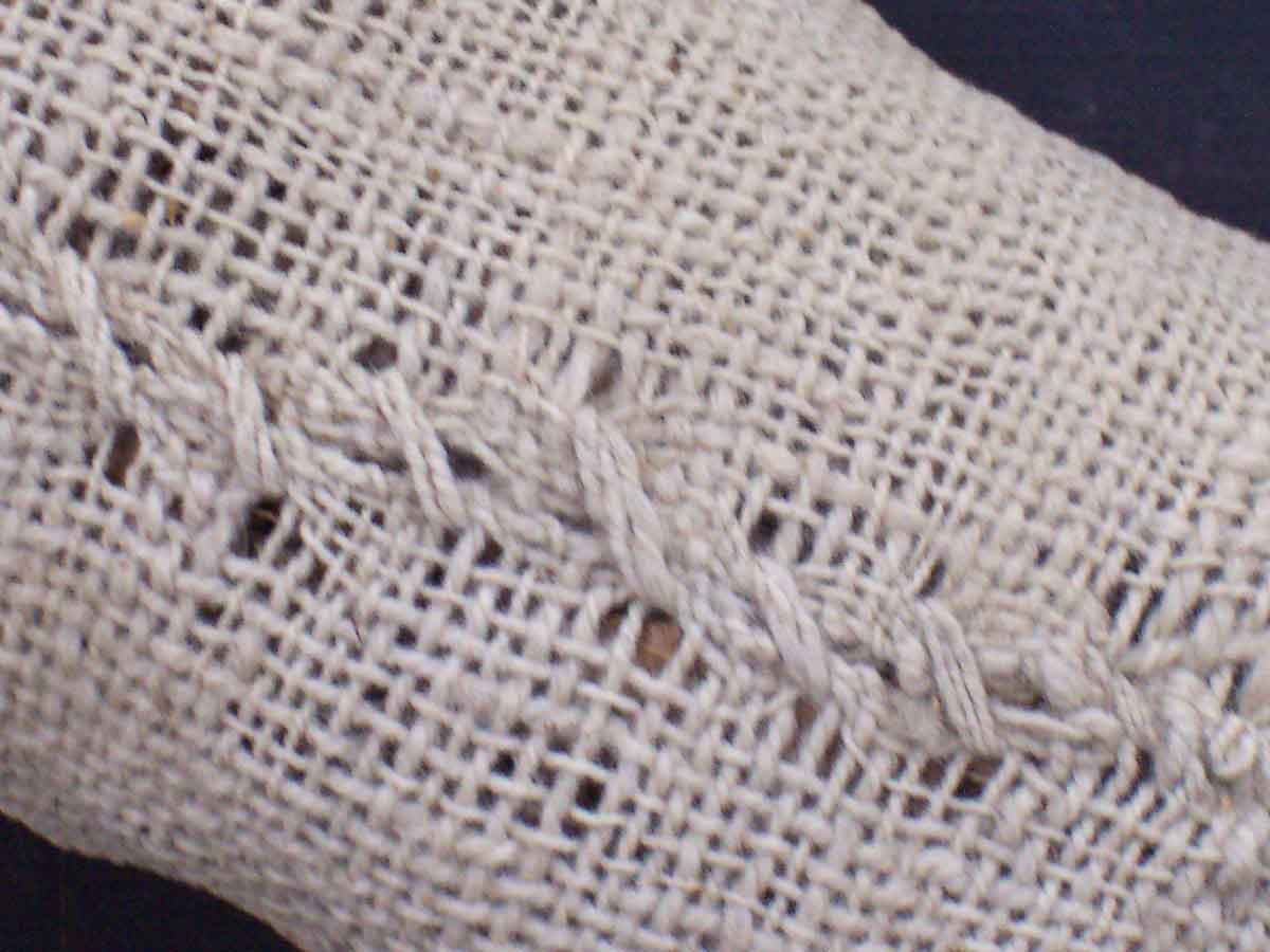 18 - Paño de tela blanca de forma cuadrangular con uno de sus extremos decorado...