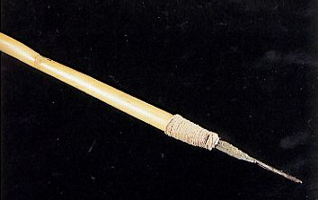 92 - Tubo de caña con orificio en su extremo, de color marrón con restos de p...
