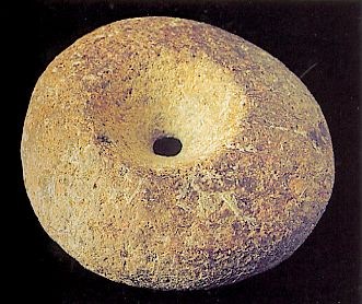 56 - Tortero de ceramica de forma bicónica, con orificio central para la inser...