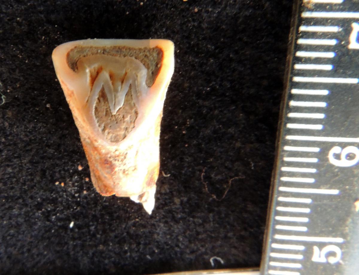 Commentary:  Upper incisors with central shovel and cingulum. The upper and lower incisors are severely worn, much more than expected when compared to the wear on the molars. It may be indicative of the use of the anterior teeth as a third hand for cultural reasons.