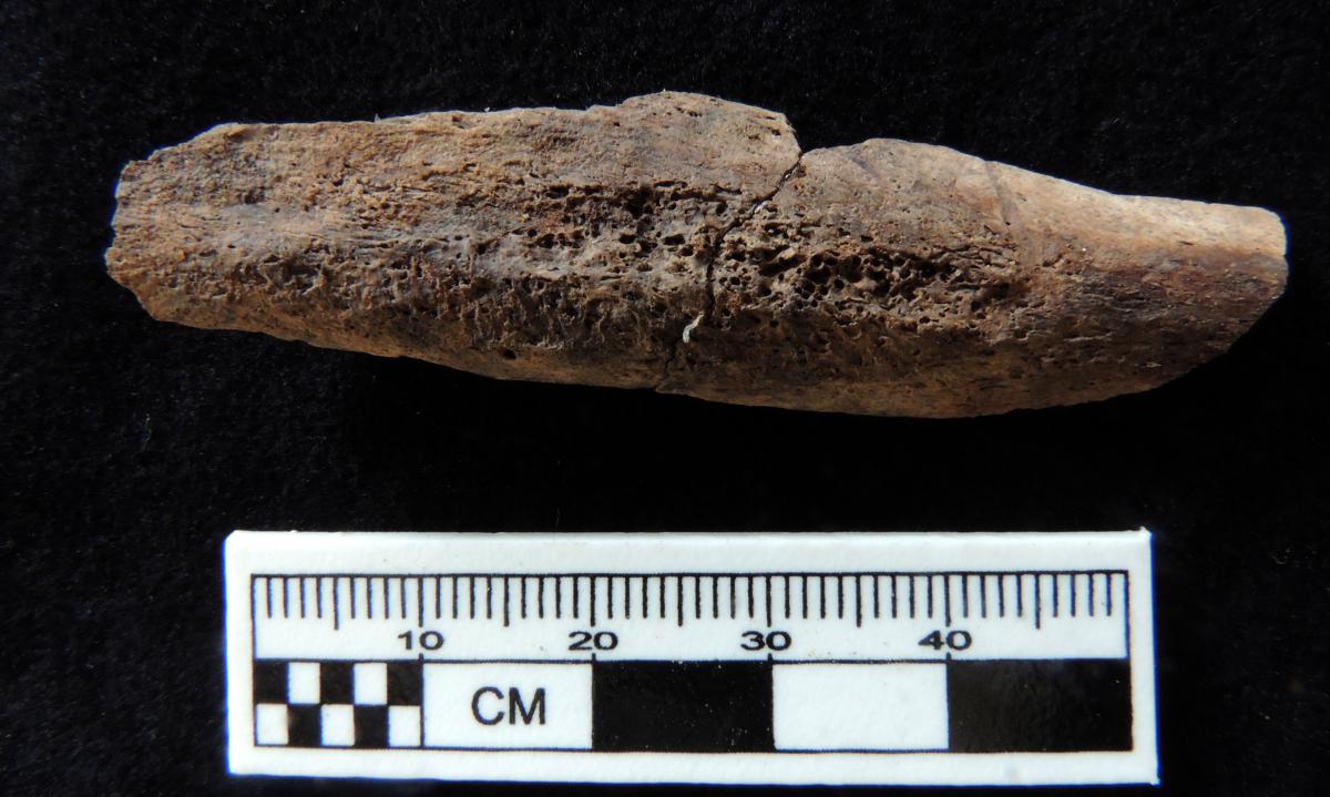 Commentary:  Periostitis. The presence of periostitis has also been noted in several bones of the postcranial skeleton. In the humerus and radius fragments. This periostitis can have an infectious origin or be the result of a severe blow that could produce a hematoma and subsequent periosteal reaction.