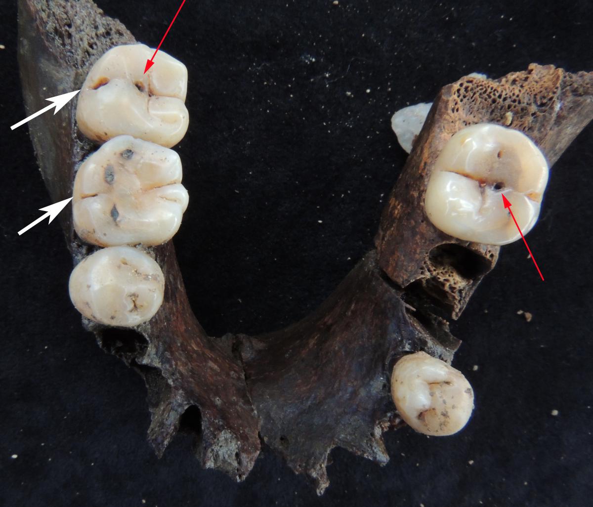 Commentary:  Incipient caries on the occlusal surfaces of several molars conserved in situ, but of little consequence to the dentin (lesions of mild severity), as well as on individual molars (red arrows), showing caries with affected dentin (medium severity; Chimenos, 2004).