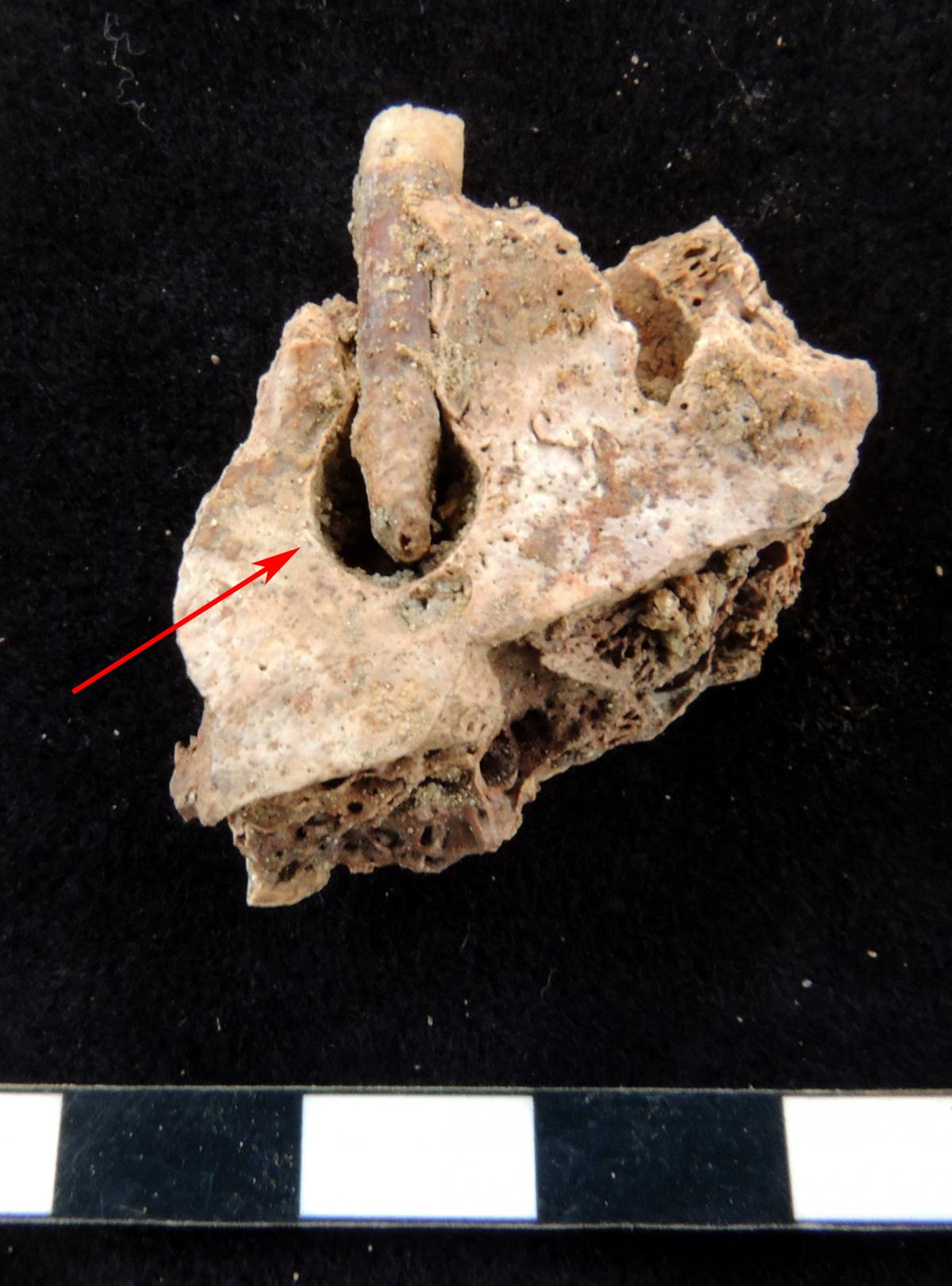 Commentary:  An abscess (red arrow) was noted on the root of the lower left canine (33), which corresponds to a cavity that has penetrated the enamel and dentine and has reached the dental pulp (severe cavity) in the crown of the same tooth (yellow arrow), as is common in this type of dental infection.