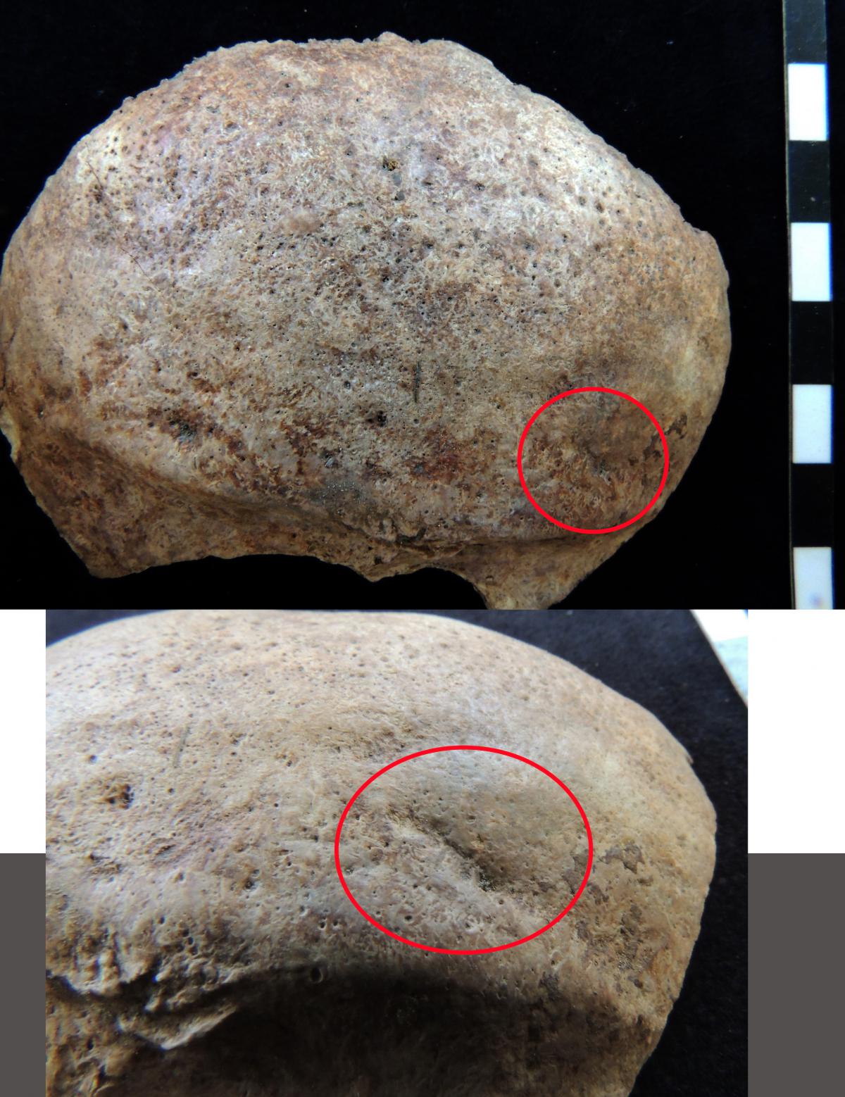 Commentary:  An antemortem injury was noted on the outer surface of the occipital bone, close to the inion area, slightly above the right nuchal line. It is a wound which the individual survived, which also shows healing and was suffered long before their death. The wound is presented as a depression of the external table, without affecting the internal table.