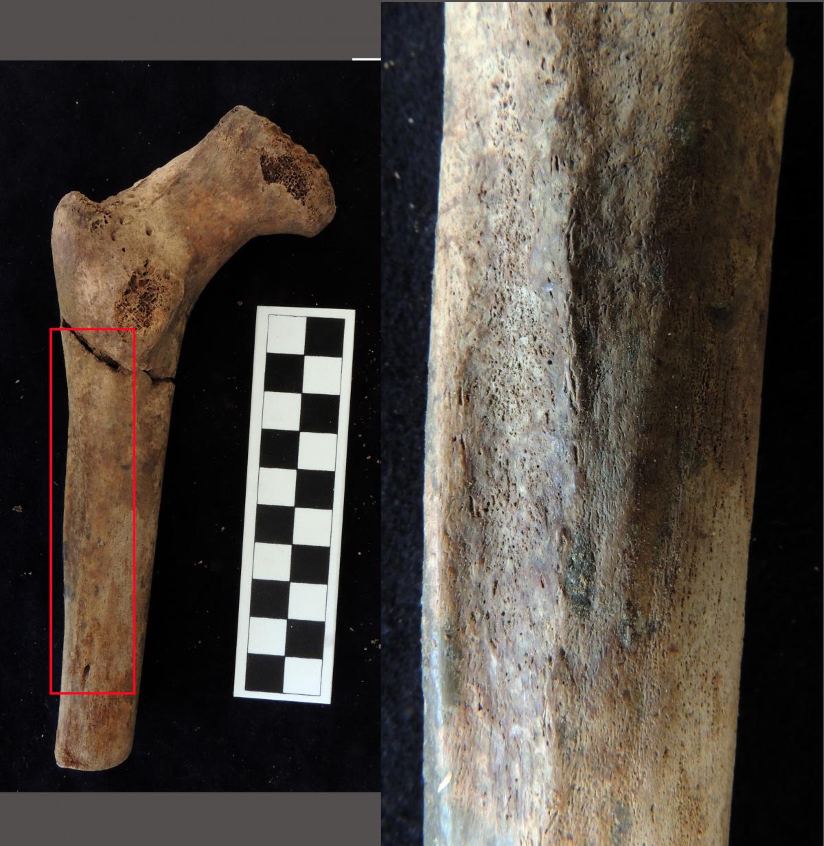 Commentary:  A pronounced hypotrochanteric fossa can be seen on the right femur, a characteristic closely linked to strong musculature in this area of insertion of muscles intrinsically related to walking.