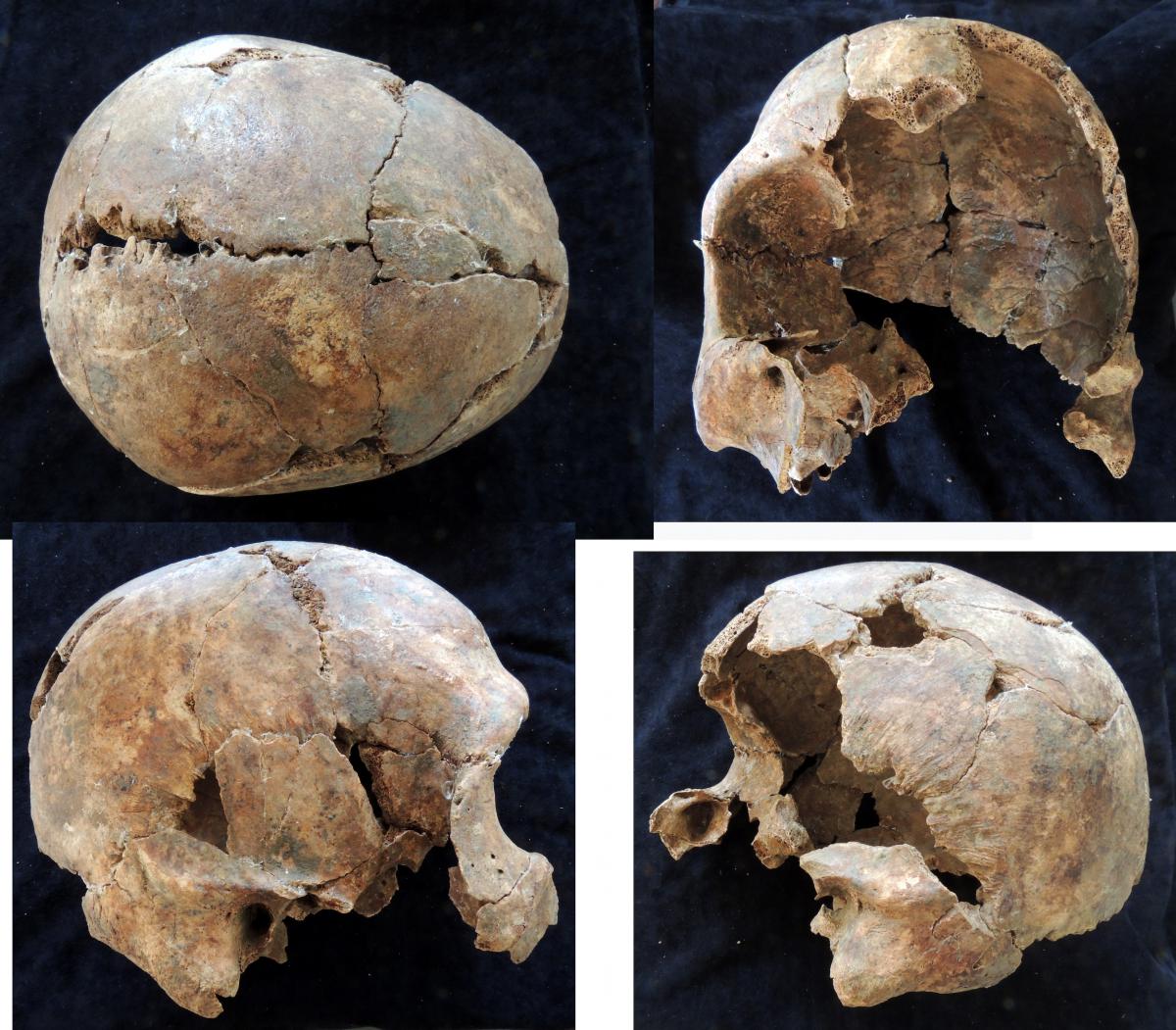 Commentary:  The skull, also recovered and reconstructed in large part, is very robust, with large supraorbital arches, mastoid processes and a very masculine inion region.