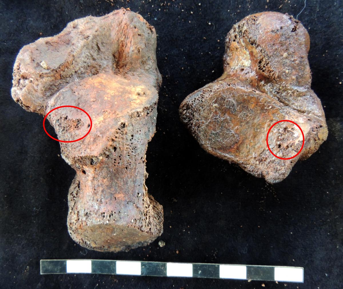 Commentary:  Osteochondritis dissecans in the upper articular veneer of the right calcaneus and its complementary joint area in the articular veneer of the right talus (red circles).