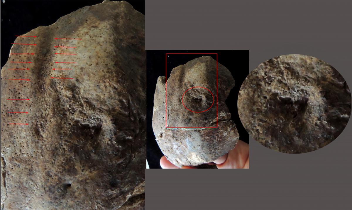 Commentary:  On the left parietal, parallel to the sagittal line, there are indications of a powerful blow with a blunt object (Blunt Force Trauma), which depressed the external table of the skull but did not affect the internal one. The cylindrical shape of the object that struck from top to bottom (red square, red arrows), can be seen. Also, in the region of the parietal (red circle), there is a depression very close to the sagittal line and above the parietal openings.