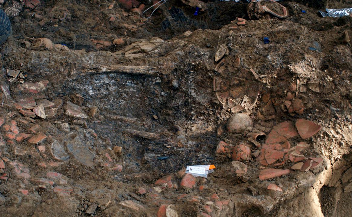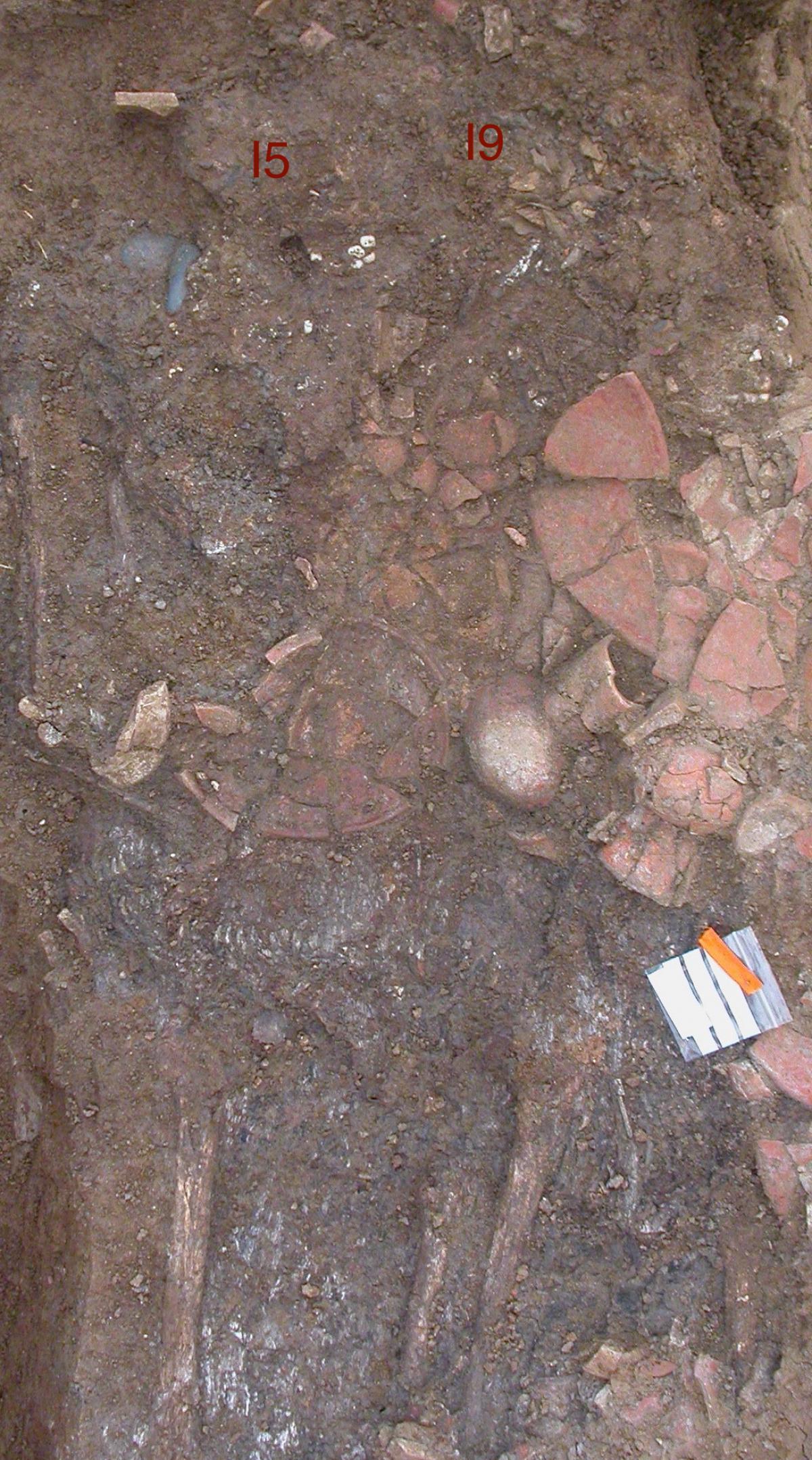 Commentary:  View of the burial of I9 and the plates and jars that were placed on their body.