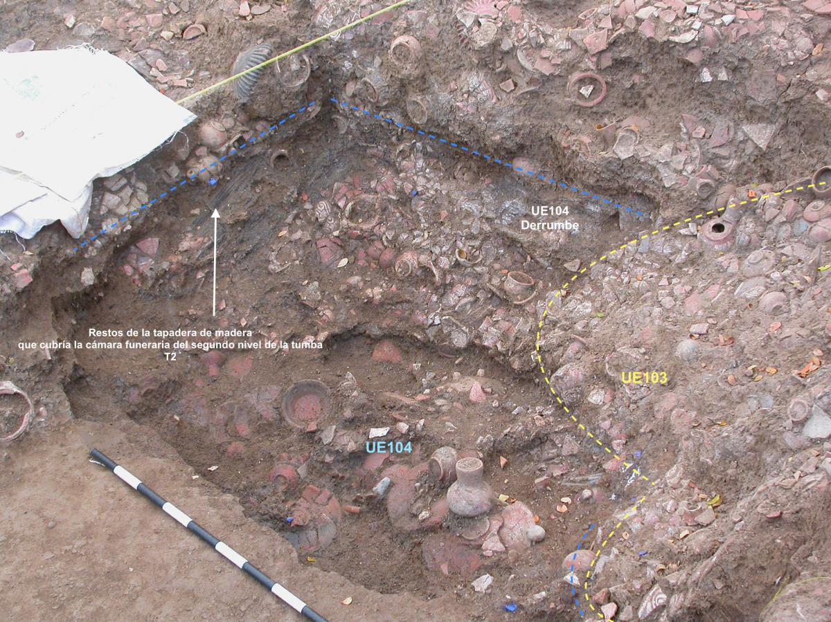 Commentary:  Detail of the collapse in the southwest corner of the grave of tomb T2.