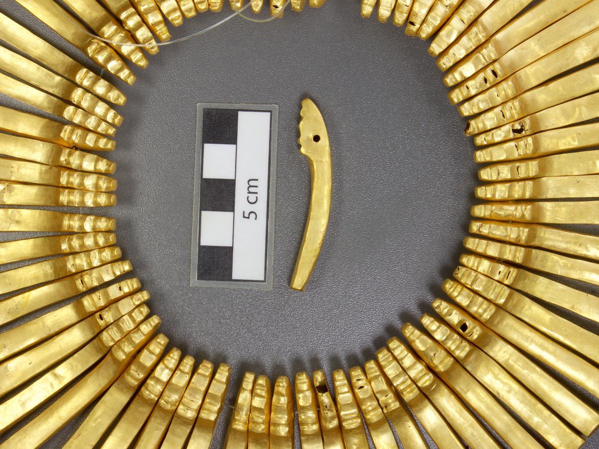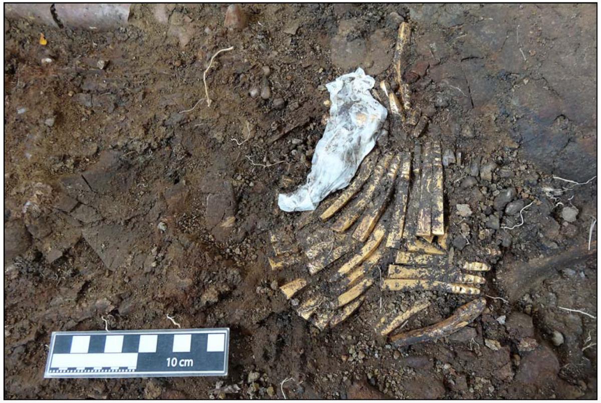 Commentary:  The necklace in situ. The crushed cranial bones and the teeth of the individual wearing it can be seen. The Japanese photo paper covers an earring made from a sperm whale tooth. Japanese paper with resin is used to lift those bone artifacts that are fragmented.