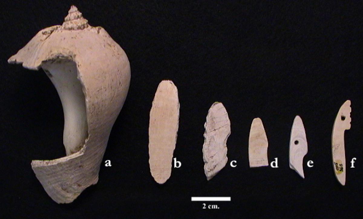 Commentary:  Sequence of manufacture of feather type beads made with shells of the species Melongena patula.