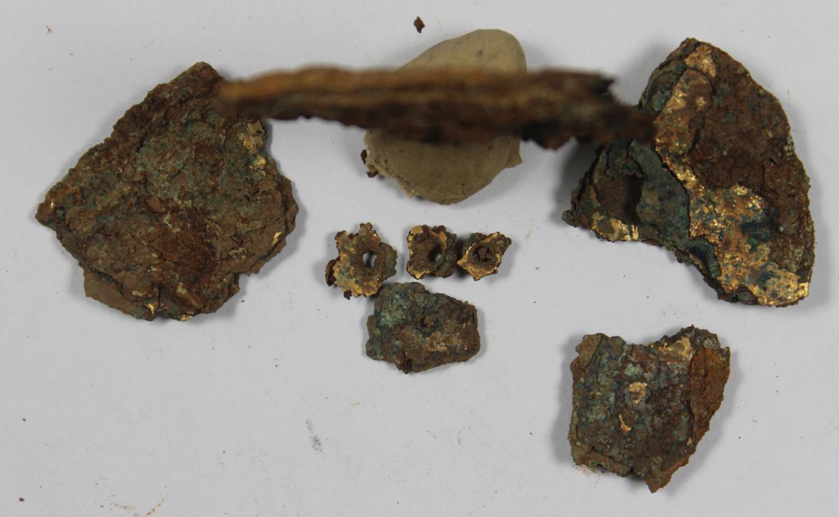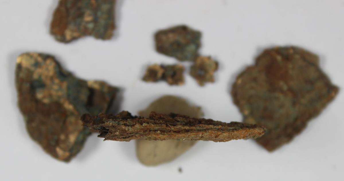 Commentary:  View of the contour of the pectoral. The fragment is very deteriorated. The contour photo shows what could be two pectorals stuck together by copper oxide.