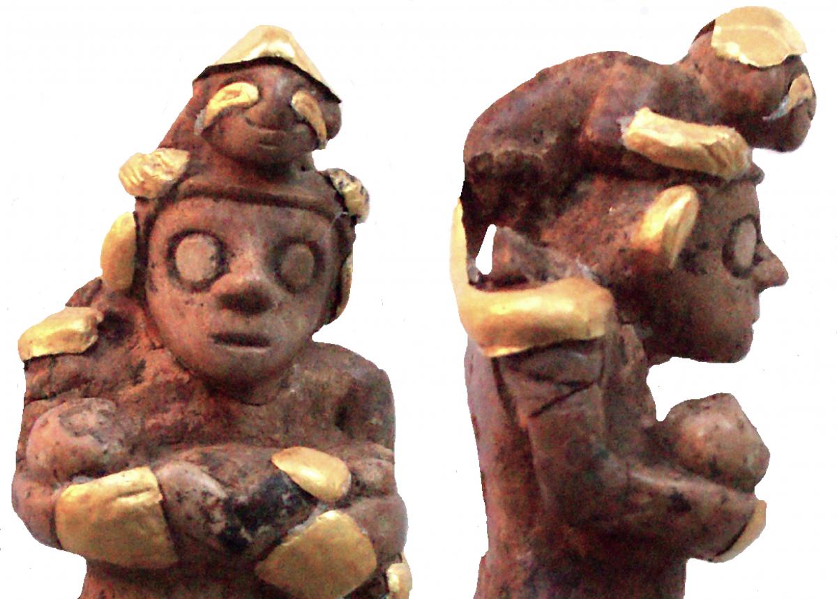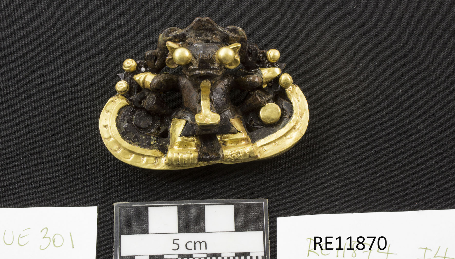 Commentary:  This digital object corresponds to the figure of resin and gold covers representing an anthropomorphic bat grabbing two sharks that were part of the grave goods of the main individual of tomb T7. This has been interpreted in the text as a mono-scene in which an anthropomorphic supernatural fisherman bat captures two sharks, and that this could take place in the underworld.