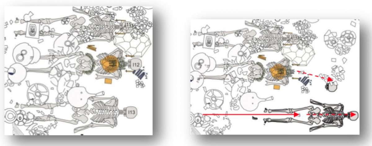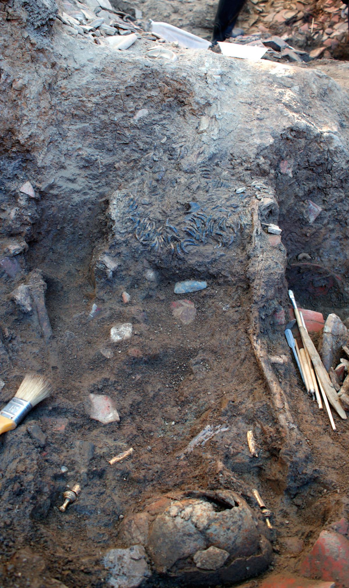Commentary:  Remains of individual I13. Part of his body was found in the third level of the T2 tomb burial, probably dragged there after a flood of the pit. Despite this, the bones were articulated and the mortuary ensembles were in their original position which could indicate that the individual was shrouded and that the displacement occurred before the funerary bundle had decomposed.