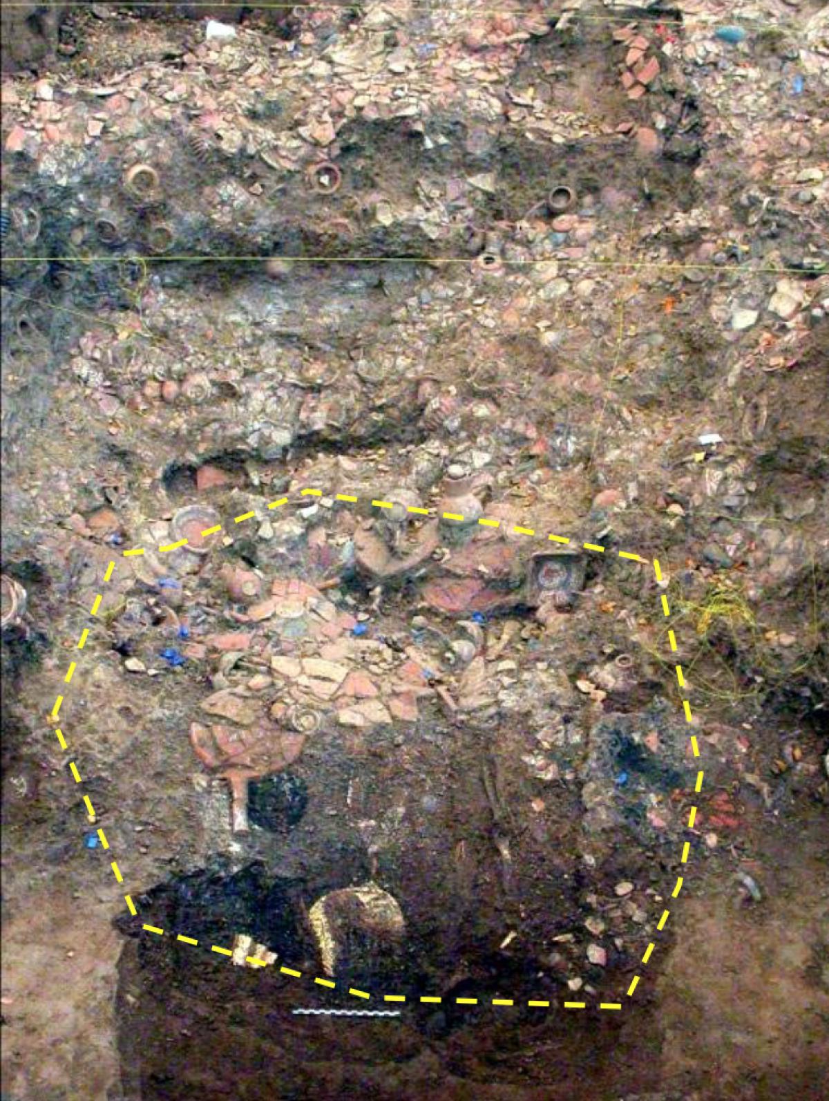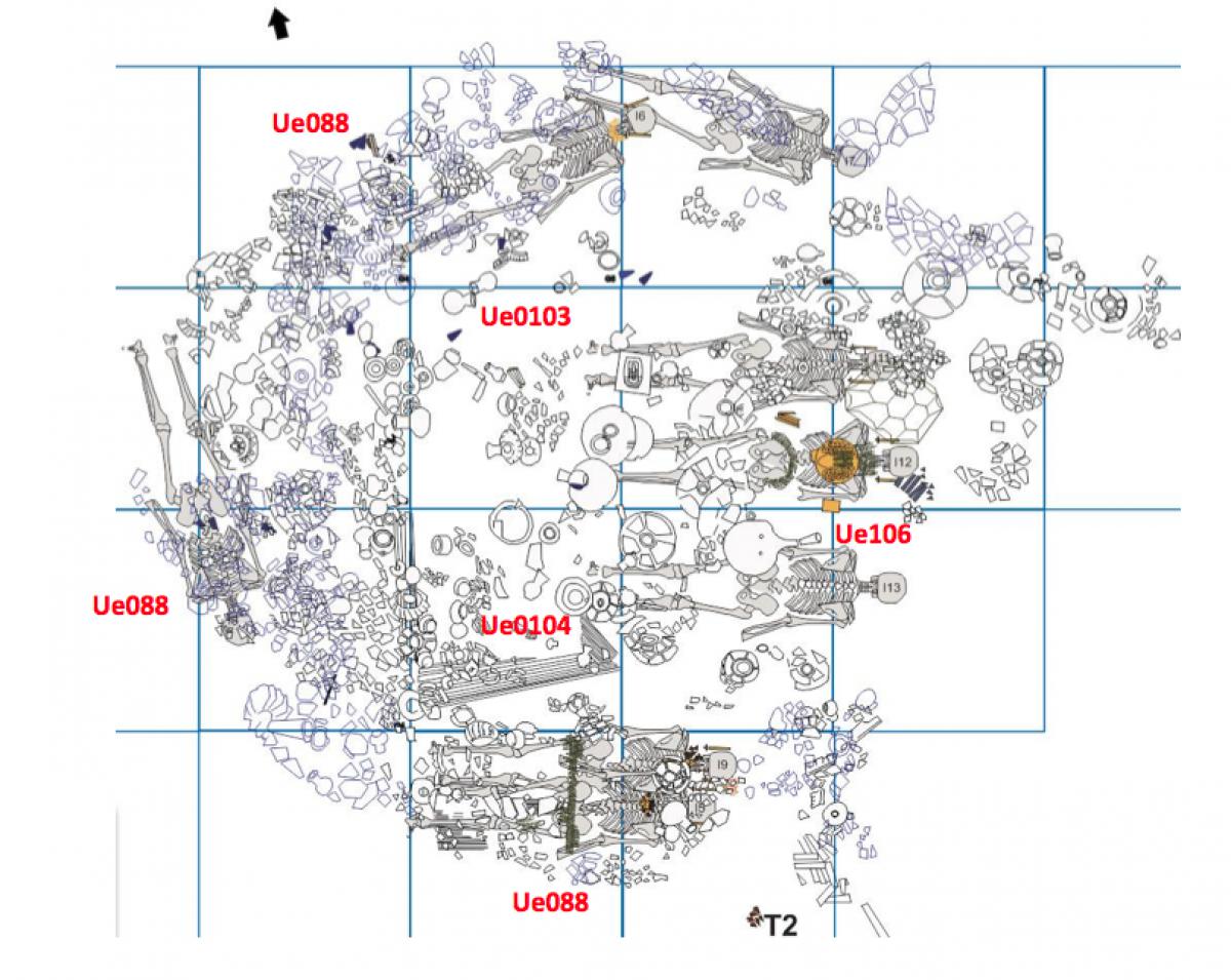 Commentary:  Complete view of the remains of individual I12. Second level burial of tomb T2.