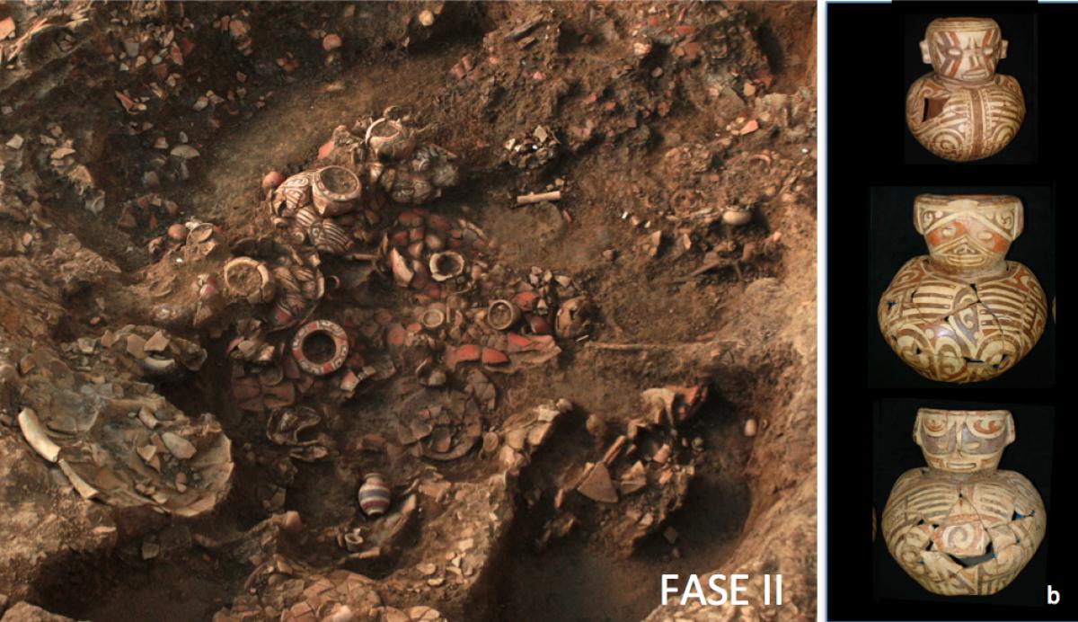 EU131. Circular ceramic deposit occupying an area of approximately 2 m2, located above the collapse of the lid of the funerary chamber in the lower vessel of the grave of tomb T2. It is made up of jugs, plates and a group of effigy vessels. The vessels are fractured, but keep their original geometry. The matrix that surrounds them is clayey, brown in colour, with some sands and coals, and small fragments of artifacts and other cultural materials. Its surface is horizontal. Its N perimeter sits on the UE106b unit (sliding of materials and bones, originally seated on the intermediate step of the grave pit). We believe that this is an offering deposited inside the grave some time after the burial, after the filling of the bottom of the grave and the episode of the collapse of the lid of the funerary chamber.