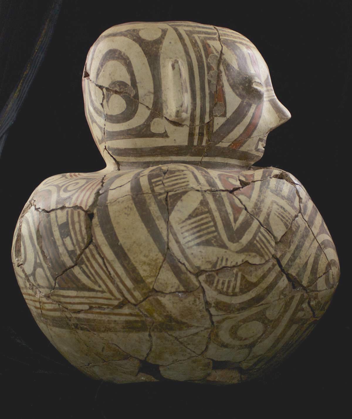 Effigy vessel. It represents a warrior from the T2 tomb. This piece combines the technique of modeling and painting decoration. The designs are geometric and refer to facial paints and/or tattoos.