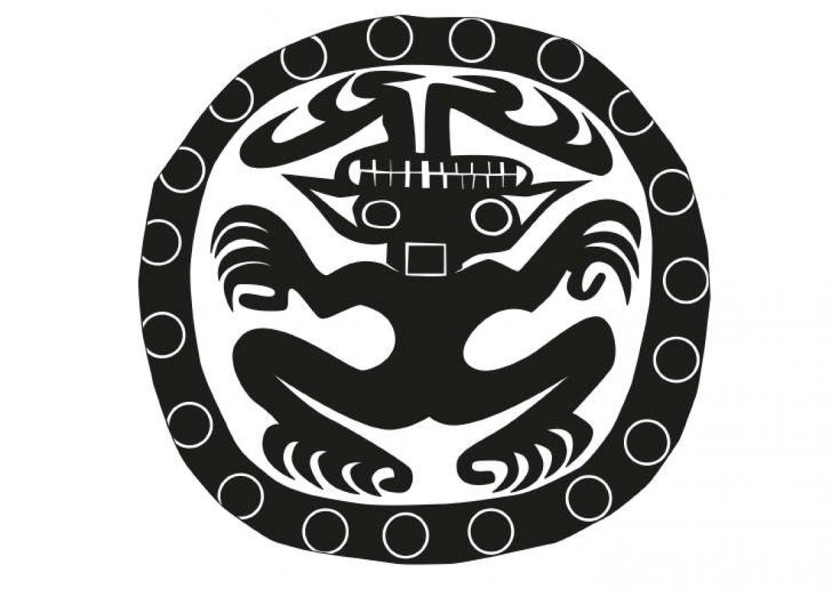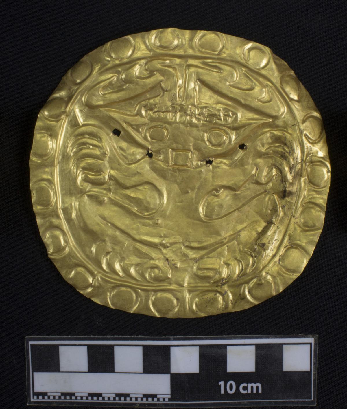 Commentary:  Circular hammered gold pectoral with the embossed image of a supernatural hybrid being of bird and reptile. Diameter:10.4 cm. Conte style.