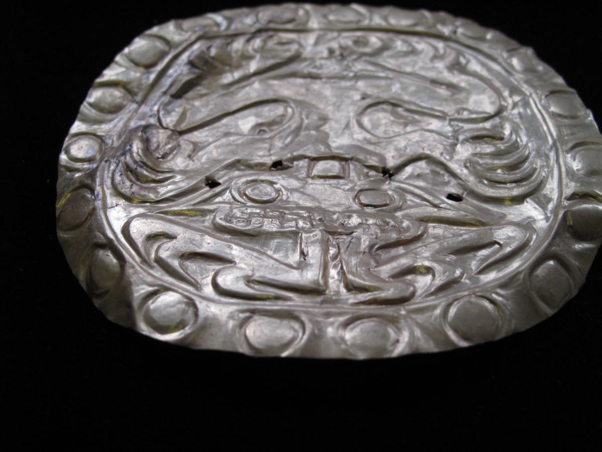 Commentary:  Circular hammered gold pectoral with the embossed image of a supernatural hybrid being of bird and reptile. Diameter:10.4 cm. Conte style. From this observation angle, the crawling crocodile aspect of the figure is better appreciated.