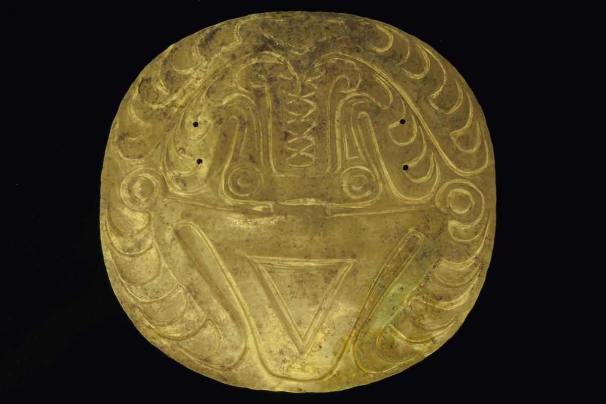 Commentary:  Discoidal breastplate of embossed gold with the design of a supernatural hybrid being of squid and bird. 18.5x19 cm. Conte metallurgical group.