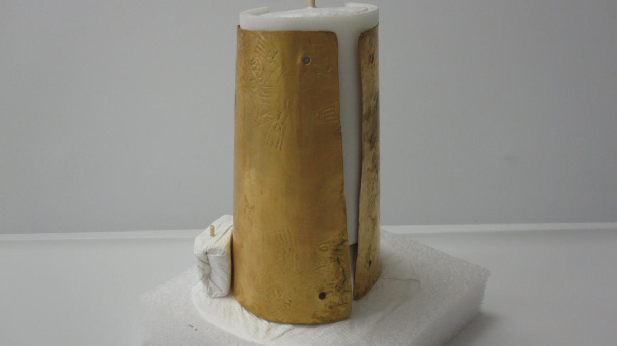 Commentary:  Hammered gold cuff associated with the remains of the individual I1 buried in the T1 tomb. It has two profile anthropomorphic crocodiles engraved in the Conte style.