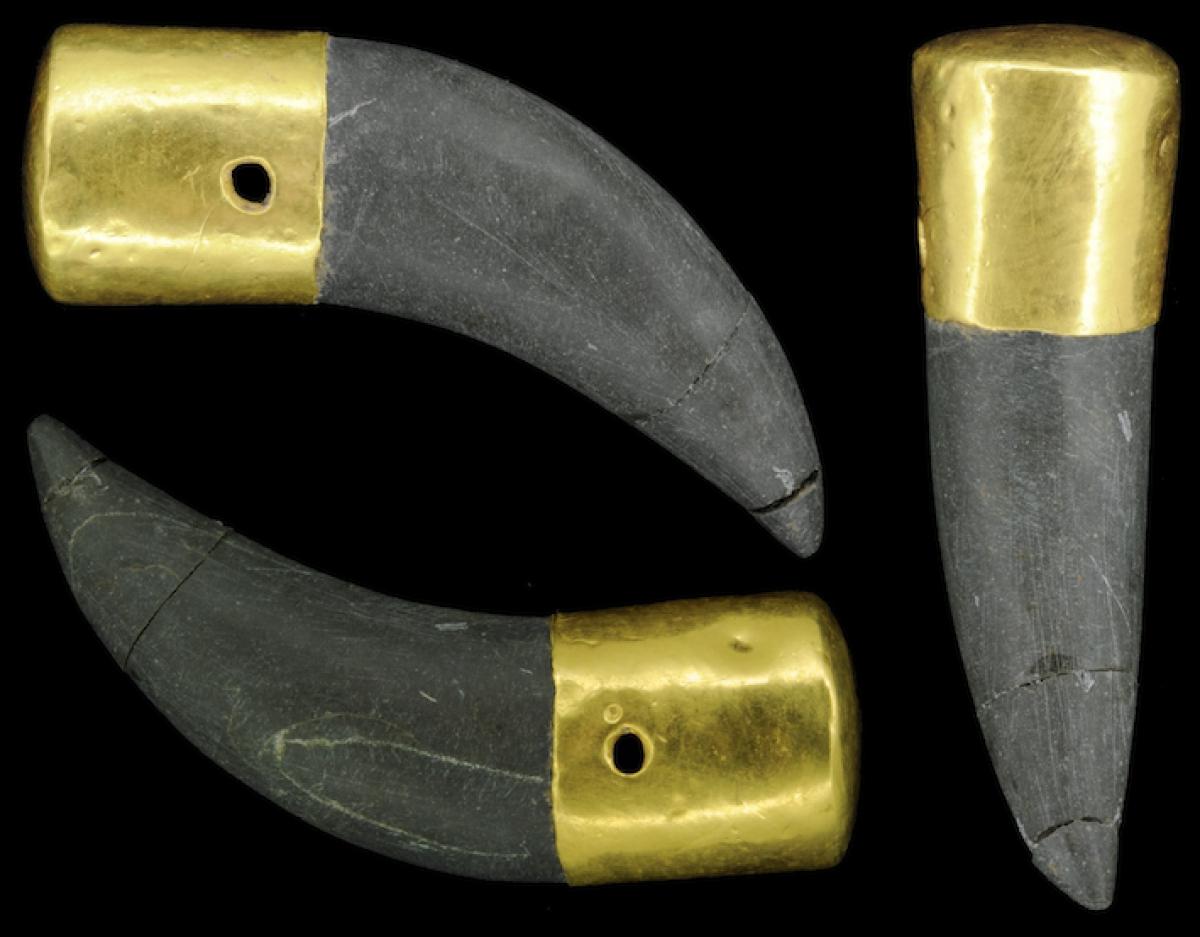 Commentary:  Gold-sheathed stone pendant in the shape of a fang.