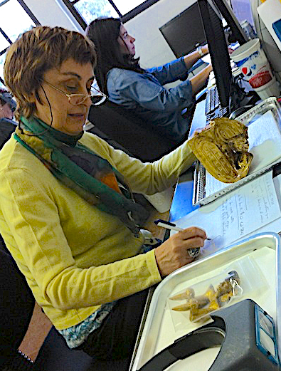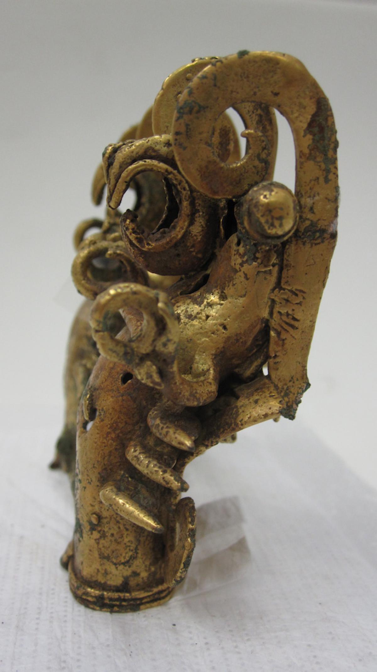 Commentary:  Left lateral view of the cast tumbaga figurative pendant that formed part of the mortuary ensemble of the individual I1 of the T1 tomb. Conte Style. 4 cm. wide.
