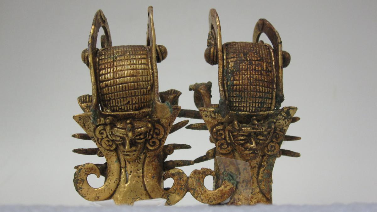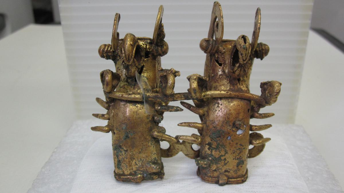 Commentary:  Back view of the cast tumbaga figurative pendant that formed part of the mortuary ensemble of the individual I1 of the T1 tomb. Conte Style. 6.5 cm. high. The figure has two possible readings: two supernatural prickly lobsters each carry two human heads on their carapaces or two figures carry the lobsters on their backs.