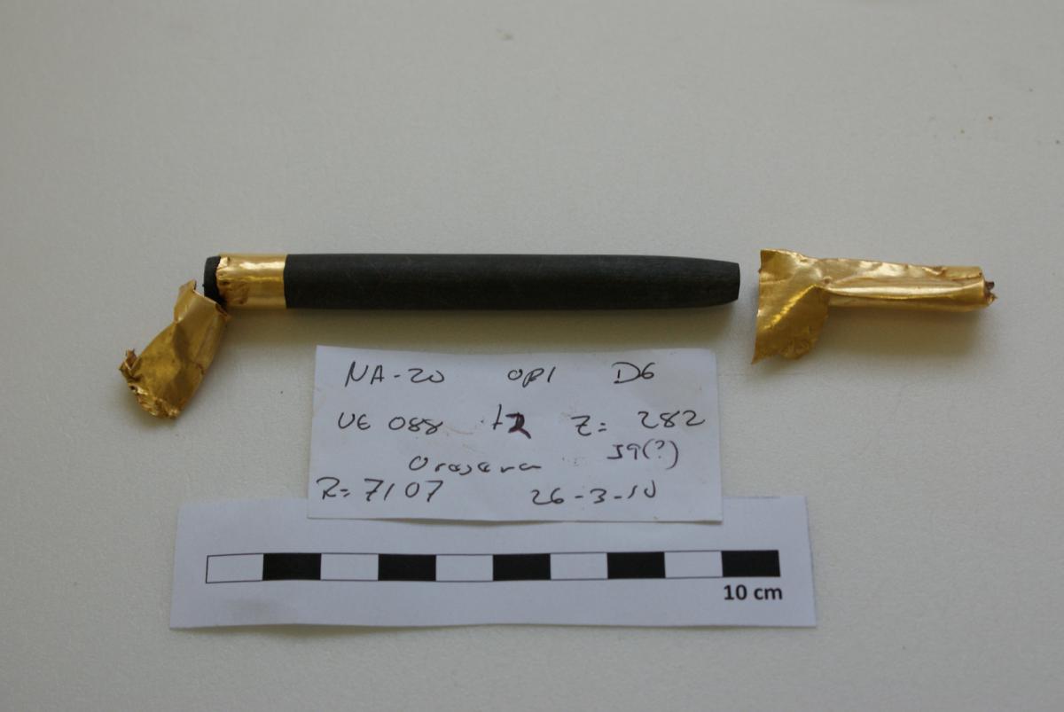 Commentary:  Stone ear rod with gold sheathings associated with the individual I9 buried in T2 tomb.