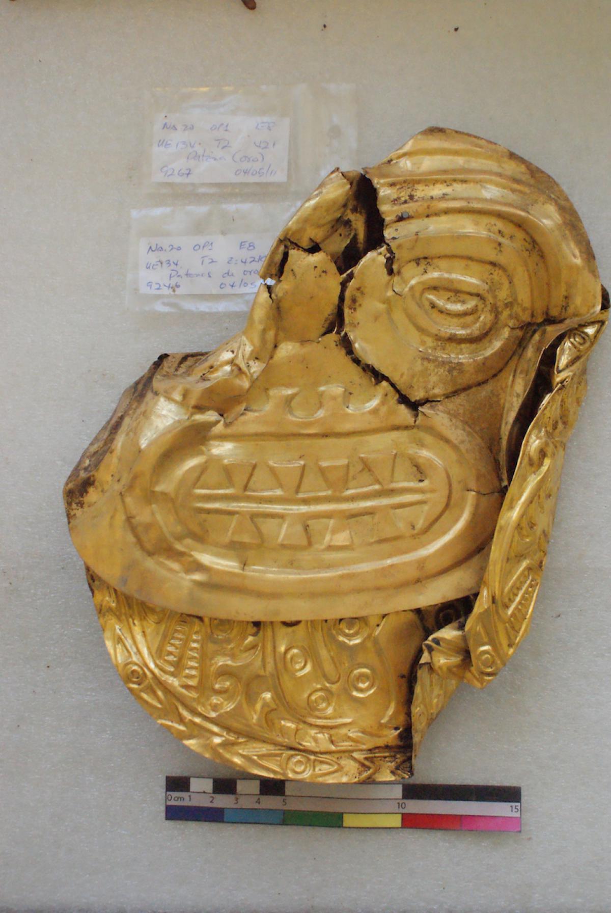 Commentary:  URL address of the article "The golden armor of a Coclé cacique chief: The golden breastplates of the mortuary ensemble of the main individual of the Tomb 2 of the necropolis of El Caño (900-1020 A. D.)". This article presents a descriptive analysis and an approximation to the iconographic interpretation of the four gold breastplates that accompanied one of the chieftains in the tomb who, judging by the ritual of his burial and the richness of his mortuary ensemble, is the individual of more status in the excavated tombs. The embossed designs on the breastplates belong to the metallurgical group called in the area, Conte Style (450-1100 AD).The four are frontal representations of supernatural beings whose main metaphorical base seems to be the crocodile and speak of a shared belief system in the area whose roots sink into the great cosmological traditions of pre-Hispanic America.