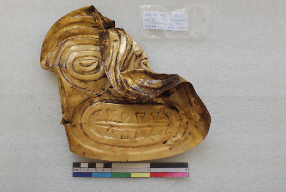 Commentary:  Embossed gold discoidal pectoral 9267, with the frontal representation of the face of a supernatural being with the features of an old man. 19 x 23 cm. Weight 112.9 gr. Conte metallurgical group.