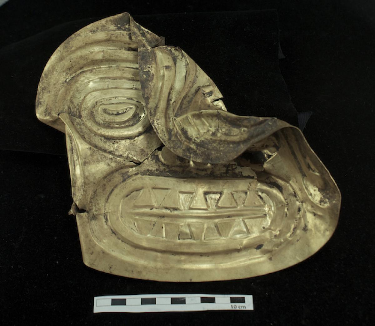 Commentary:  Rear view of pectoral 9267 in which is embossed the face of a supernatural being with the features of an old man. 19 x 23 cm. Weight 112.9 gr. Conte metallurgical group. The back of the pectoral 9267.