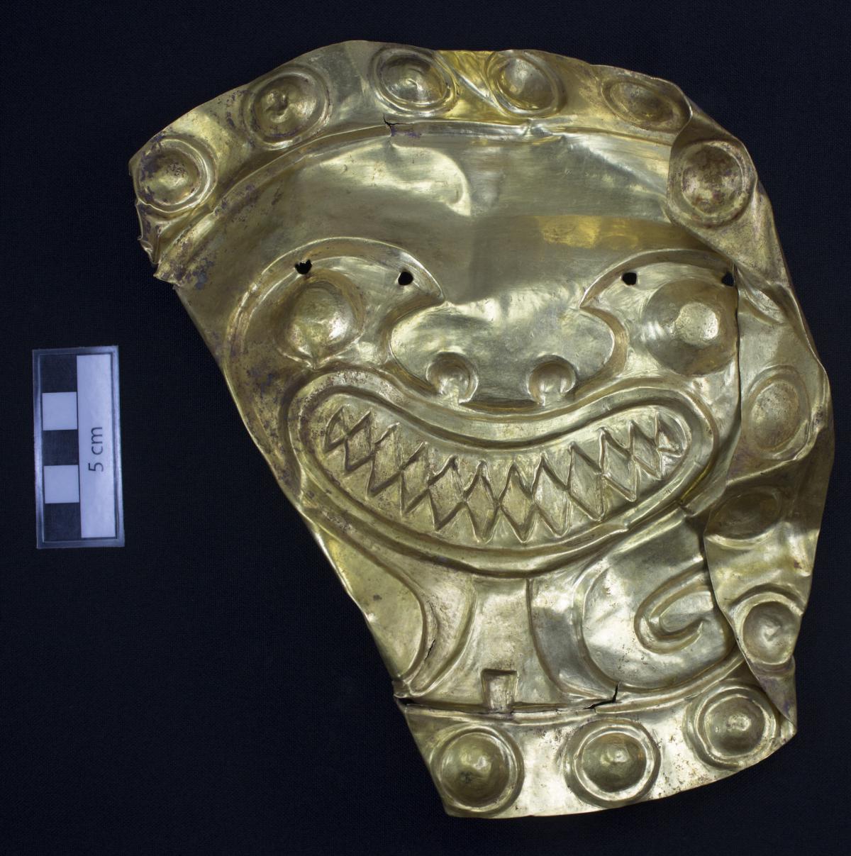 Commentary:  Embossed round gold breastplate with the design of a supernatural being with mythical crocodile features. 21 x 24 cm. Weight: 183 g .Conte Metallurgical Group.