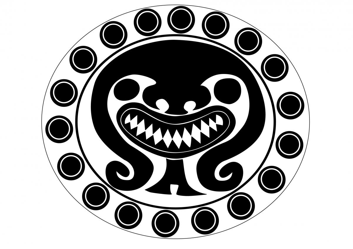 Commentary:  Drawing of pectoral 9266 depicting the face of a supernatural being which has the features of a mythical crocodile.